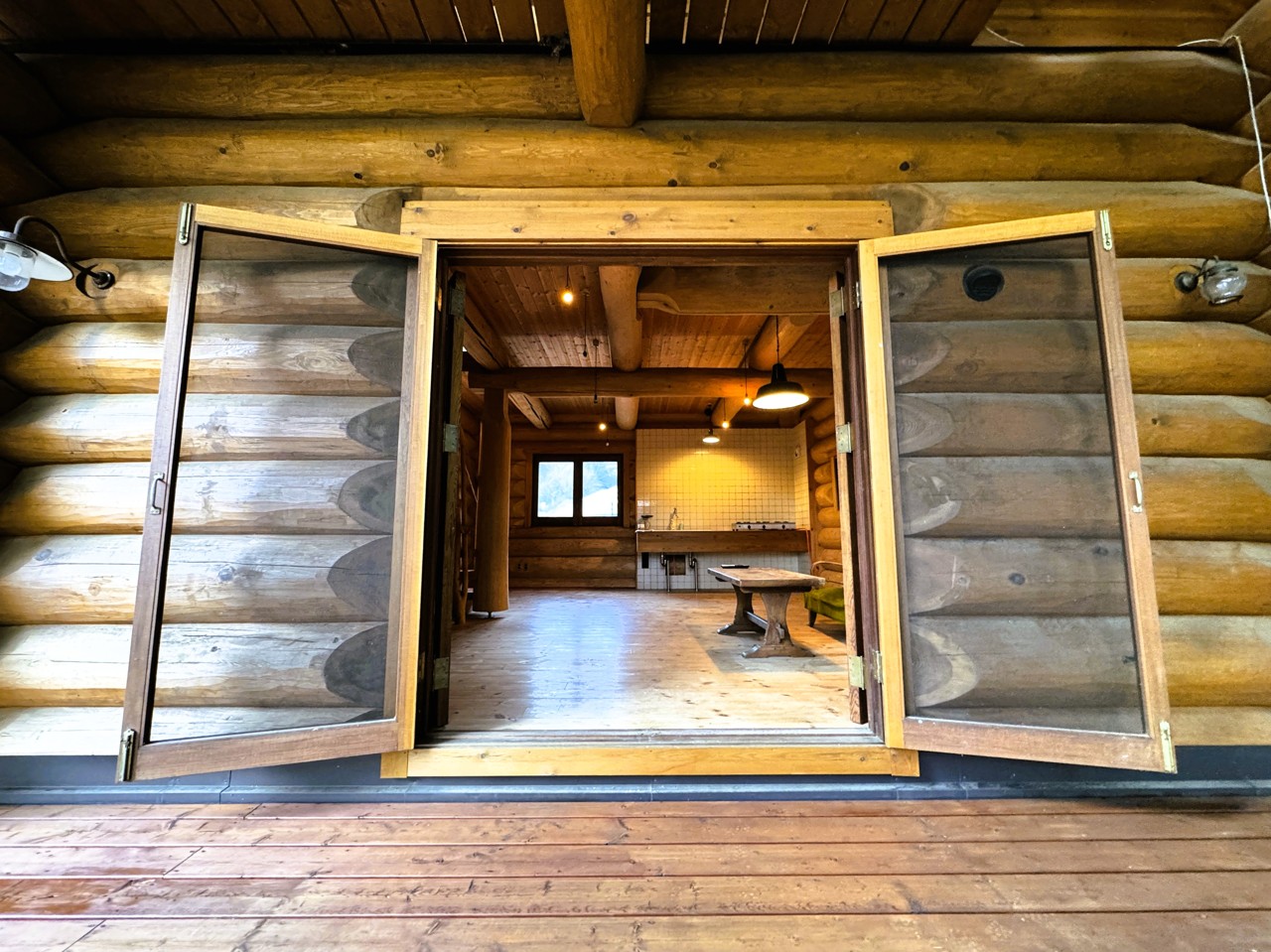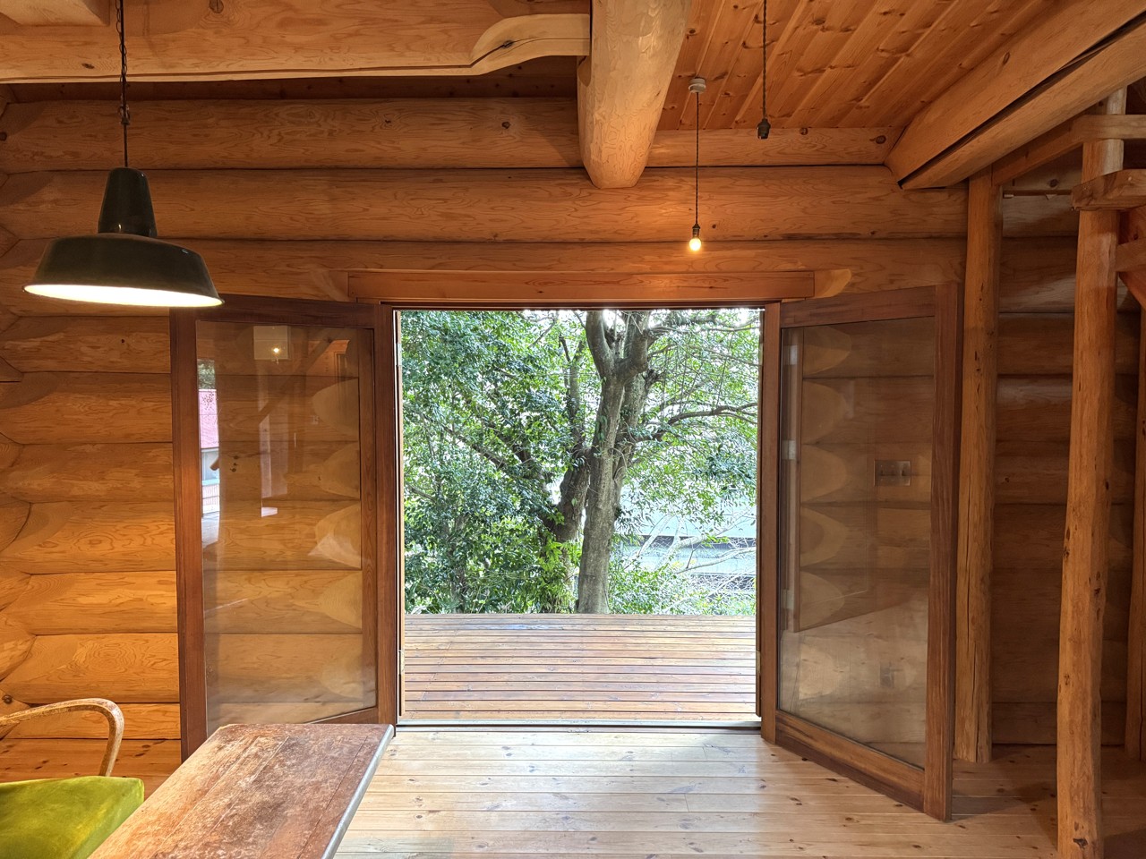 リビング前のウッドデッキから見た室内です。大きな開放的なドアが素敵です。