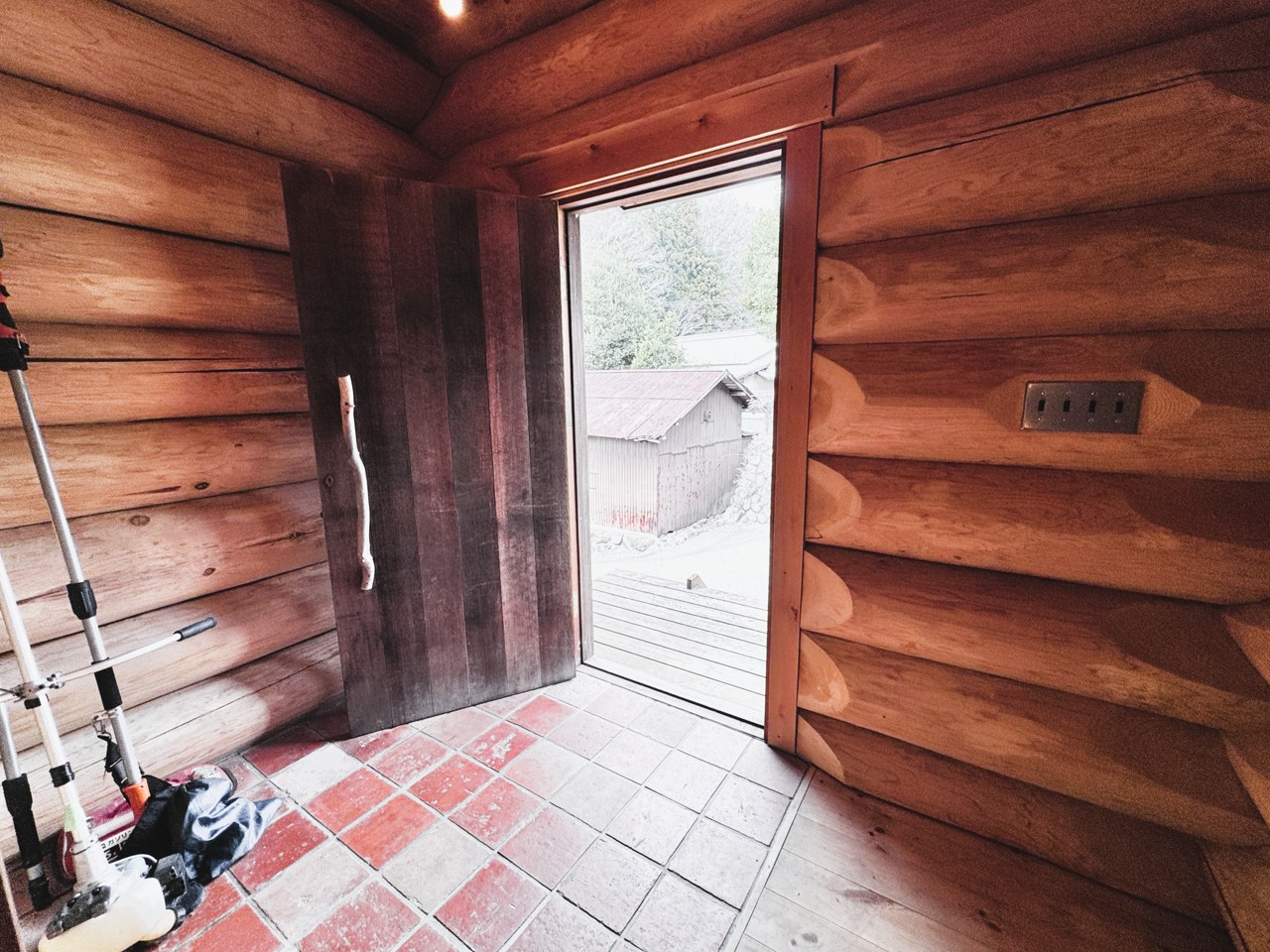 玄関ドアは内側に開きます。床のタイルはイタリヤの古城で使っていたタイルを取り寄せて貼っています。