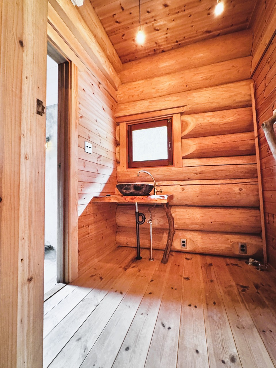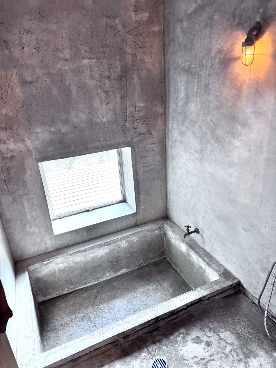 温泉風につくあられています。浴槽・床はコンクリートで造られています。壁はコンクリート風のモルタル塗りです。