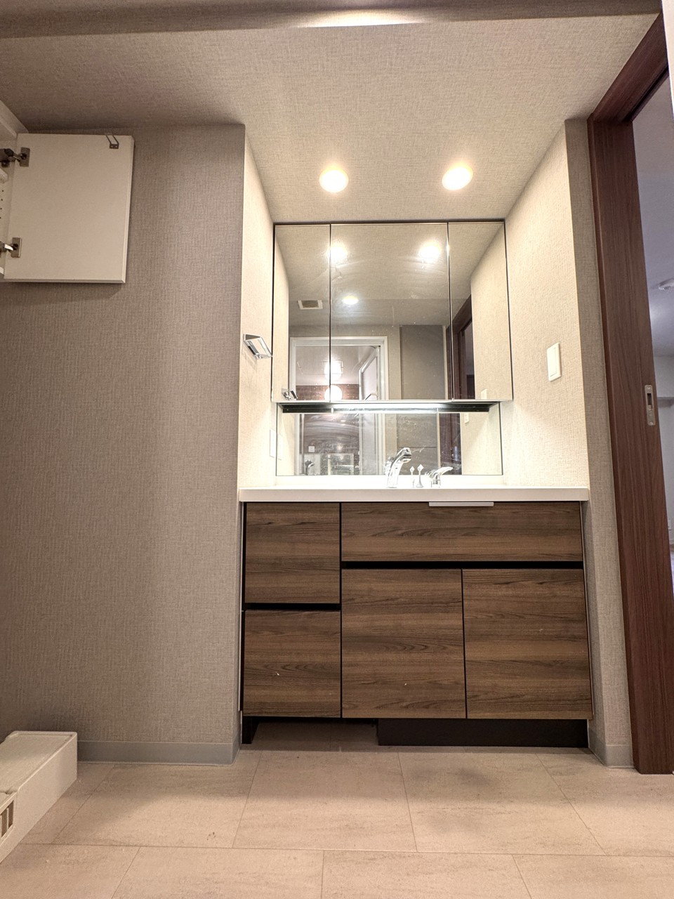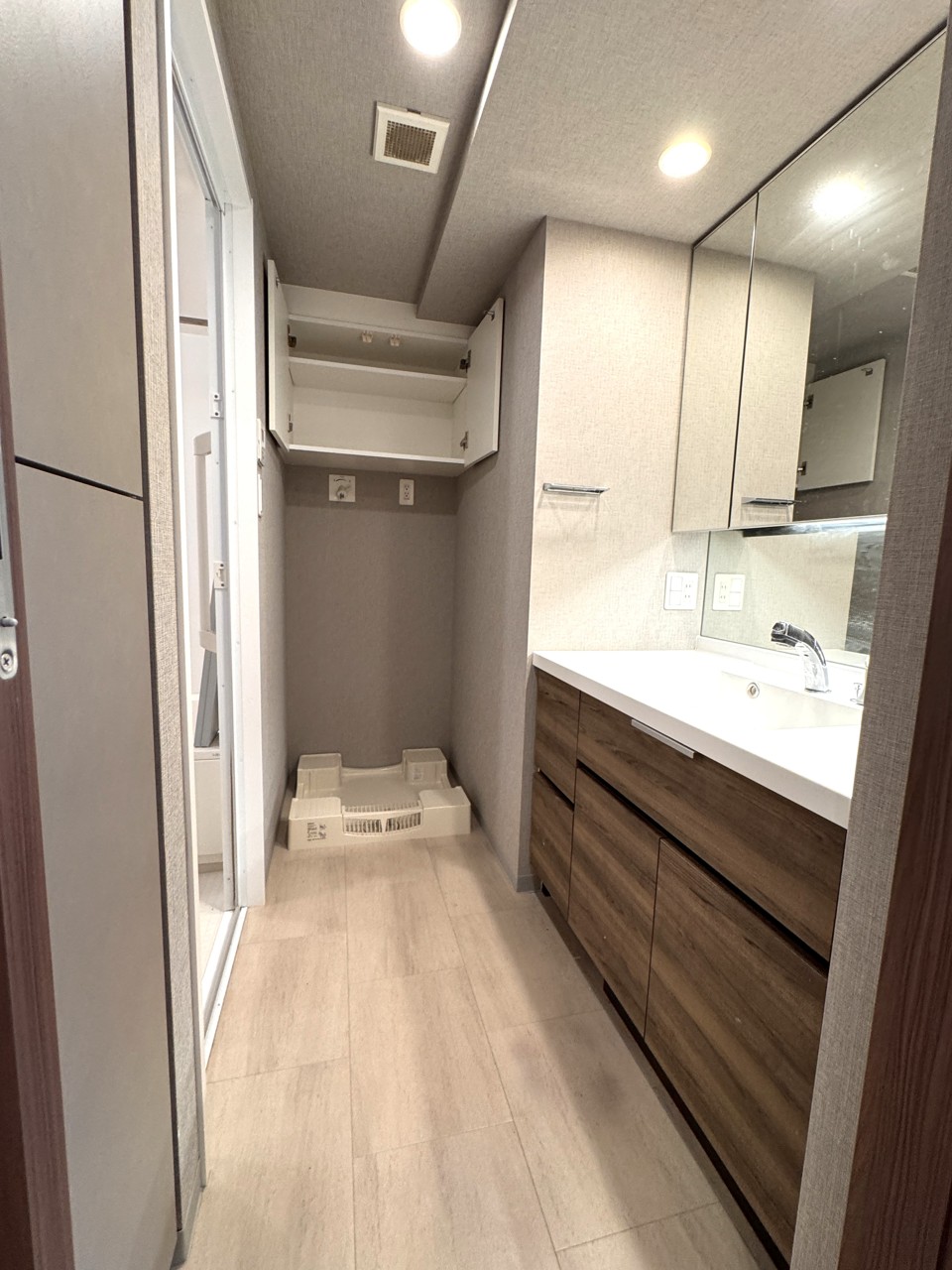 正面が洗濯機置き場です。吊戸があるためストック用品等の収納が出来ます。