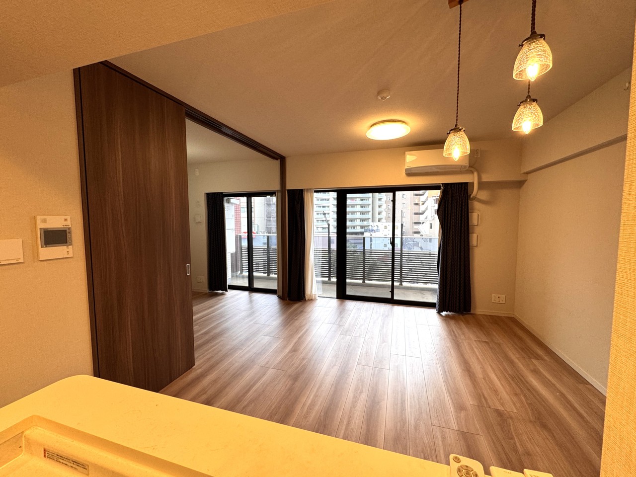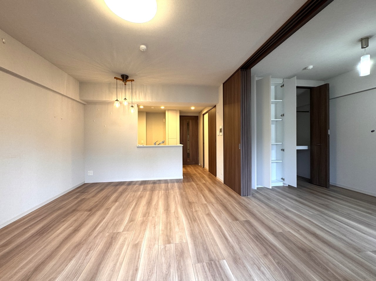 リビング隣接の洋室ですが、吊りタイプの扉のため、床の仕切りが無く、開放して18帖のLDKとして使えます。
