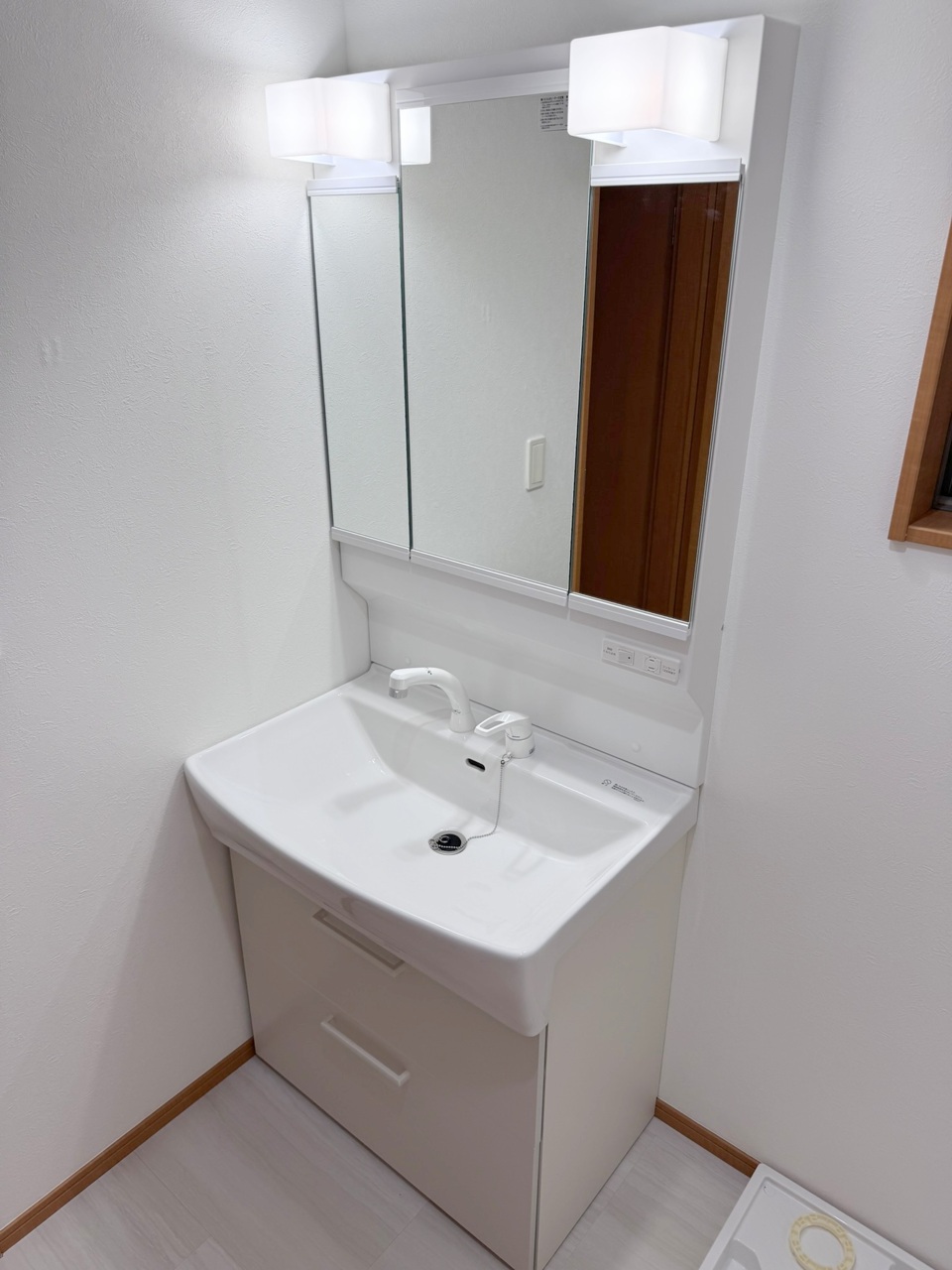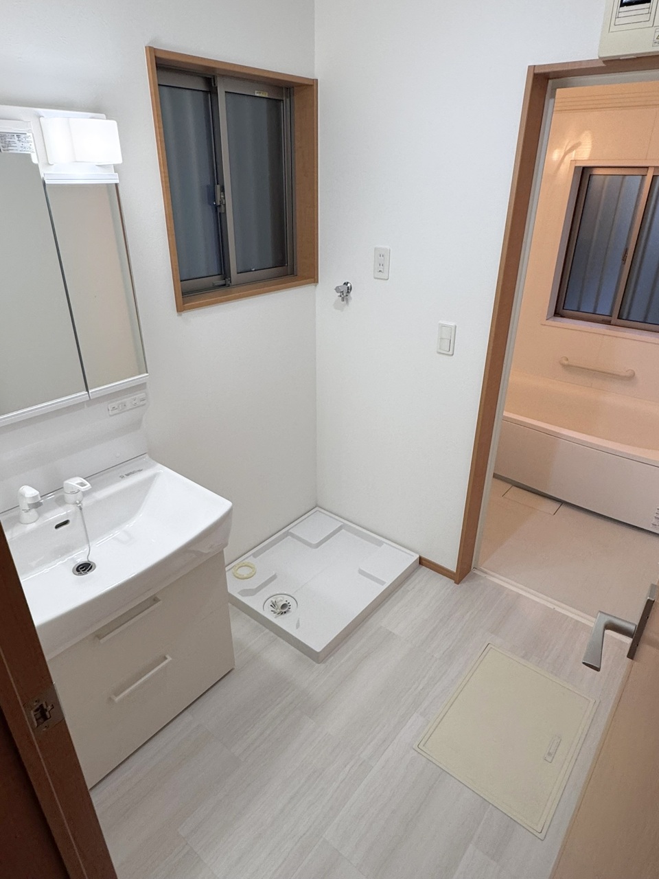 約1坪の洗面所です。洗濯機置場にはドラム式洗濯機も設置可能です。