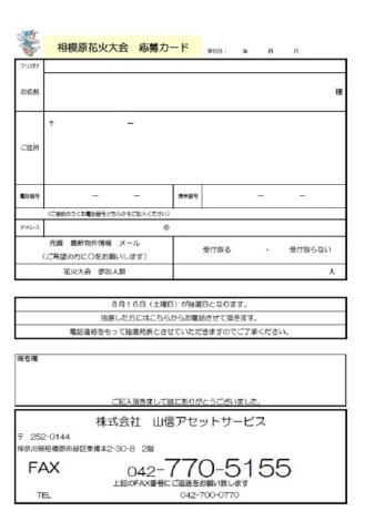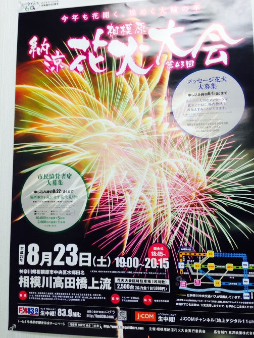 山信アセットサービス HOME耳より情報!! 8... ヤマシン NEWS&TOPIX 2014年7月31日 耳より情報!! 8月23日(土)19時から20時15分まで相模川の花火大会があります。 当社、山信不動産、ヤマシン建築設計、賃貸山信の4社は、 花火大会のスポンサーなので抽選で3組(1組4名様)合計12名様をスポンサー席にご招待します。 花火大会の見学をご希望の方は、当社にお気軽にお問合せください♪ (担当白川) 第1回抽選日は8月16日(土)となります 第2回抽選日は8月21日(木)となります お客様情報をご記入していただき FAXまたは下記のお問合せフォームから応募をお願いいたします 相模川花火大会 お問い合わせ・資料請求(無料)